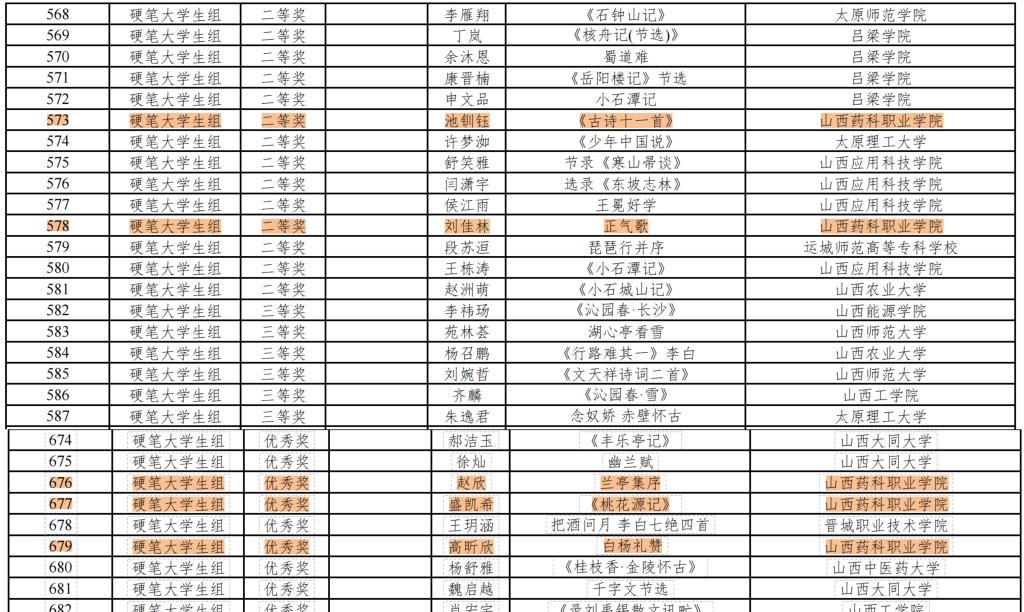 2024级药学3班学生池钏钰的《古诗十一首》、2023级药膳与食疗2班学生刘佳林的《正气歌》斩获二等奖;2024级药学9班学生赵欣的《兰亭集序》、2024级药学6班学生盛凯希的《桃花源记》、2024级药物制剂技术2班学生高昕欣的《白杨礼赞》获评优秀奖。