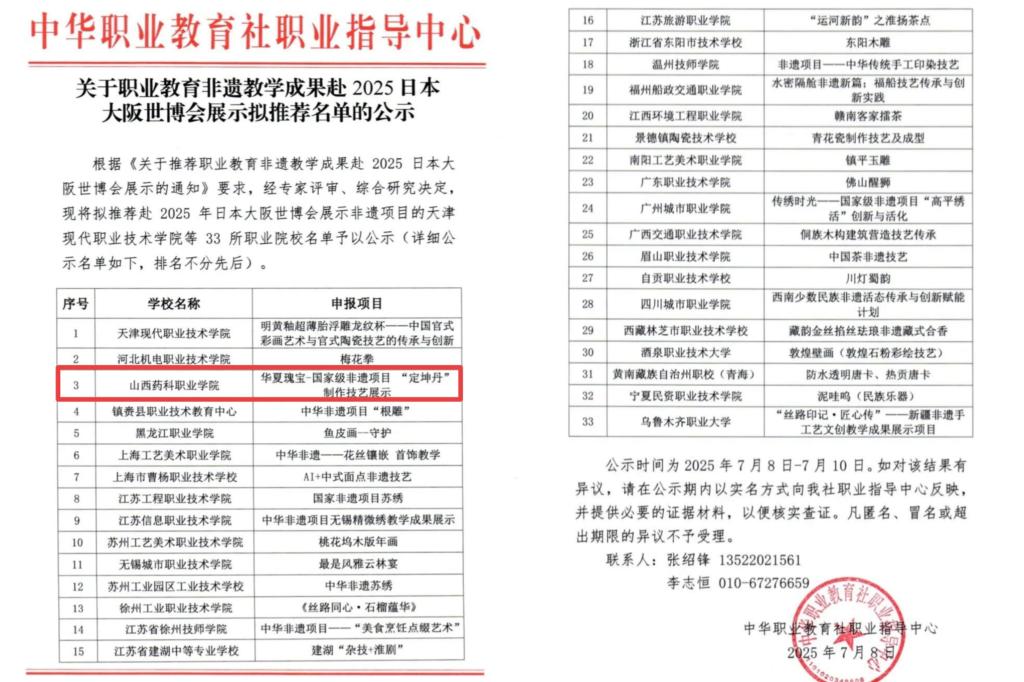 作为本次赴大阪世博会展示的山西省唯一一所职业院校,365上市公司官网入口的展示不仅是自身非遗教学成果的输出,更成为山西职教传承中华优秀传统文化的“窗口”。中药传统手工制丸技艺是中医药文化的重要载体,365上市公司官网入口长期将传统技艺融入中药类专业人才培养,开设《中药制剂技术》《非遗技艺传承实践》等课程,组建“非遗技艺传承工作室”,获评2个“全国老药工传承工作室”,牵头成立国家级培育支持的黄河流域中药材产教融合共同体,立项建设教育强国项目——中药材产教融合实训基地,等等。此次活动正是365上市公司官网入口多年职教非遗传承成果的集中展示。